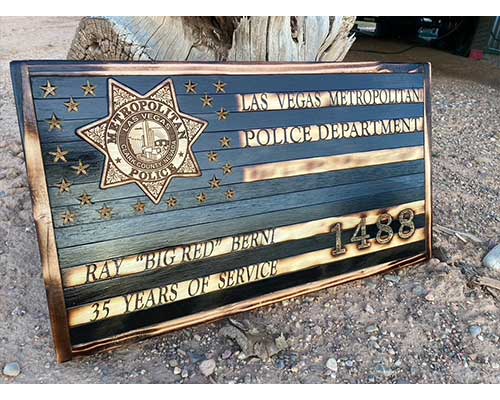 The 16" badge plaques are primarily made of locally purchased redwood. To enhance the value and personality of the badge, I customize the piece with the name, badge number and any other desired information.