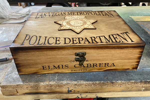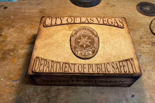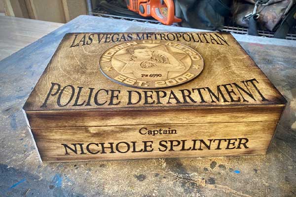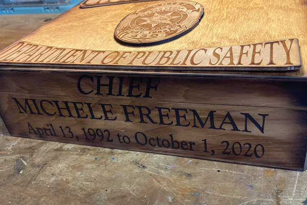 The 16" badge plaques are primarily made of locally purchased redwood. To enhance the value and personality of the badge, I customize the piece with the name, badge number and any other desired information. Customized boxes are made of pre-fabricated cornice boxes.