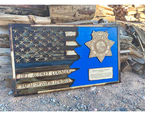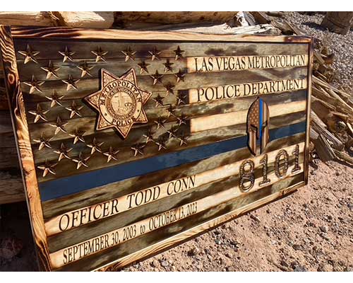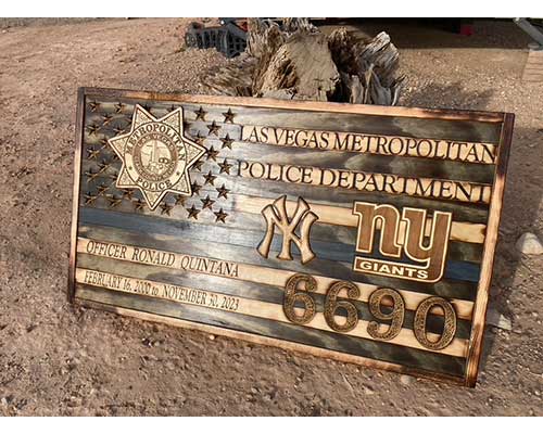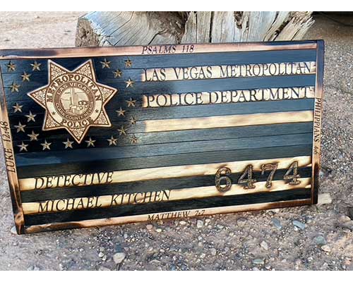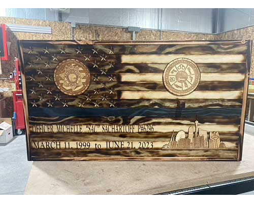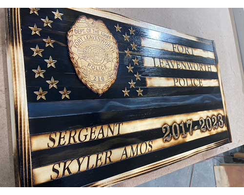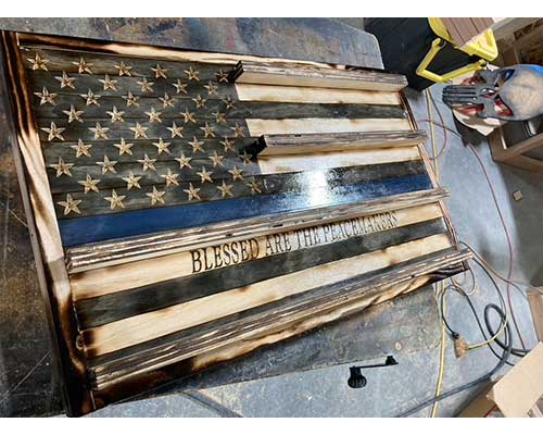 All text on each flag stripe is wood burned by hand. Any badge, logo, or symbol can be added. By default, each flag is designed in the distressed motif.