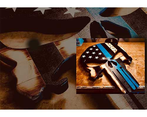 It's no surprise that they have been used as symbols, logos, and unit insignias among law enforcement and military entities. I have merged the Thin Blue Line and American Flag design into these plaques and incorporated my customization to enhance the character of the piece. Each plaque is cut out on the scroll saw and hand-painted. I hand-rout badge numbers, names, and unit/squad numbers. I incorporate the CNC machine for stars and other additional text when necessary. As an added feature on these plaques, I affix two 3/4" wood pieces on the back so that when hung up, they appear to be "floating" on the wall.